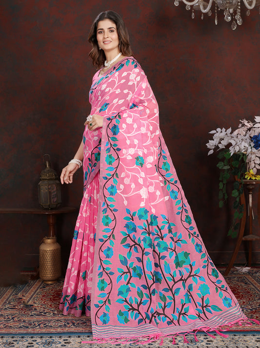 Lovely Pink Floral Jaal Cotton Muslin Saree