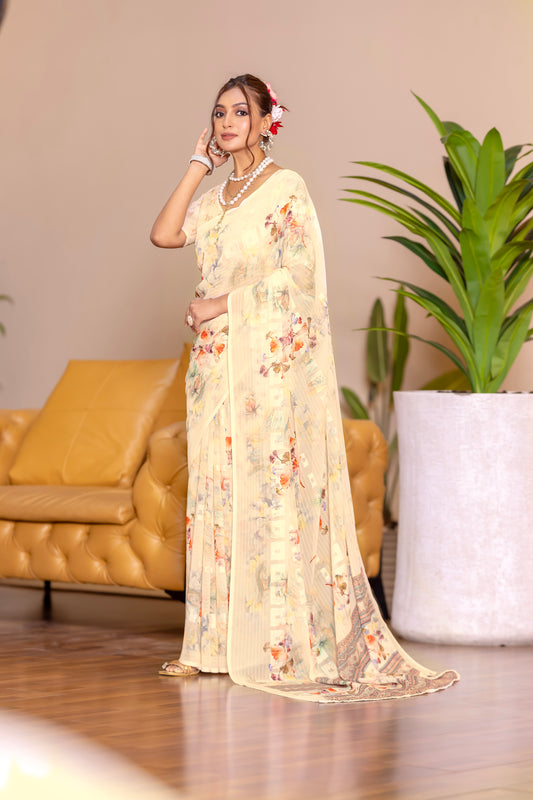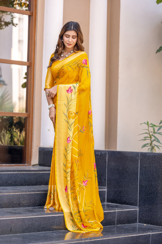 Chiffon Mustard Yellow Saree Featuring Delicate...