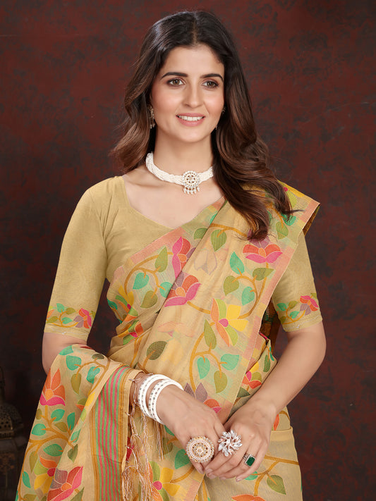 Warm Beige and Golden Floral Jaal Cotton Muslin...
