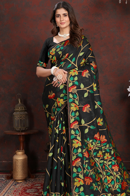 Elegant Black and Golden Cotton Muslin Saree wi...